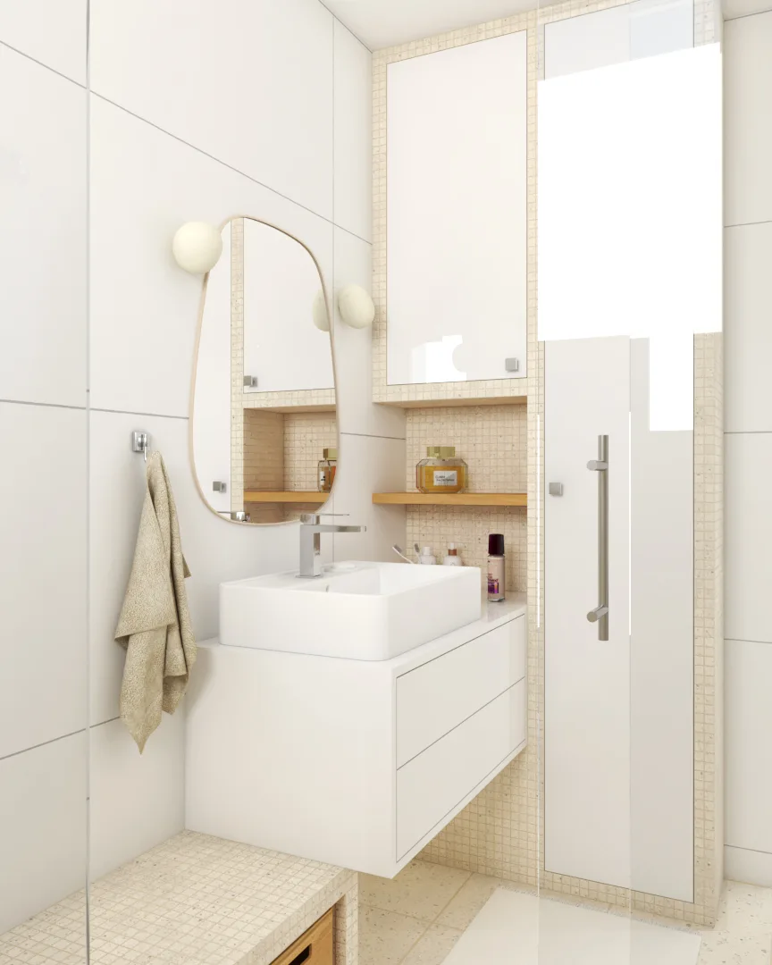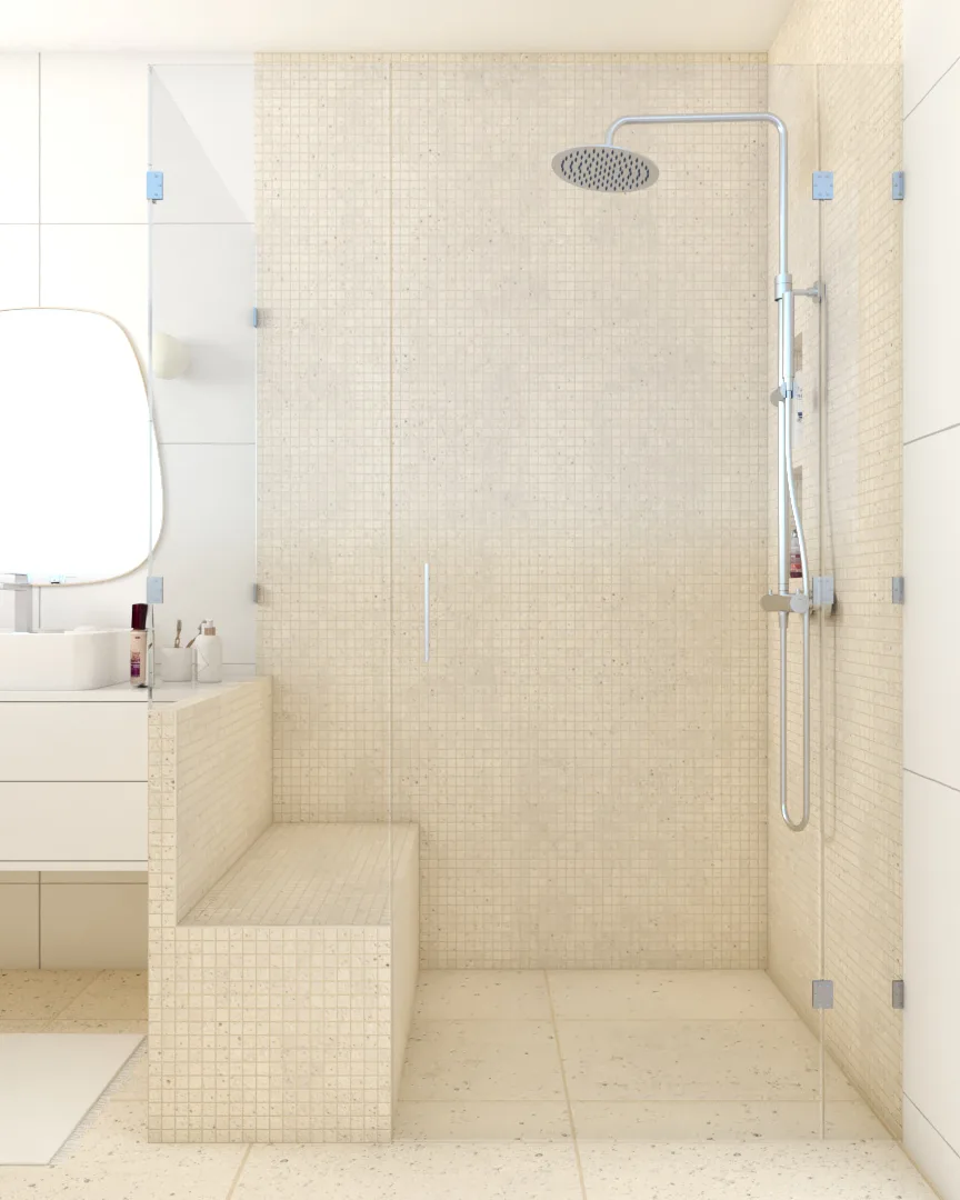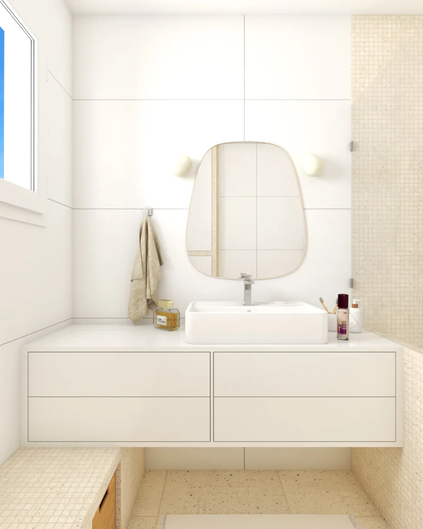 Les formes organiques ont été privilégiées pour accentuer la douceur de l’espace : le banc arrondi, le miroir et les appliques murales contribuent à une atmosphère apaisante. Le résultat est une salle de bain élégante, sécurisée et pensée pour accompagner les propriétaires dans les années à venir, en alliant praticité et esthétique sans compromis.