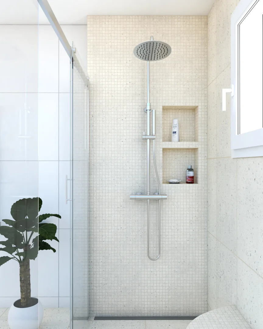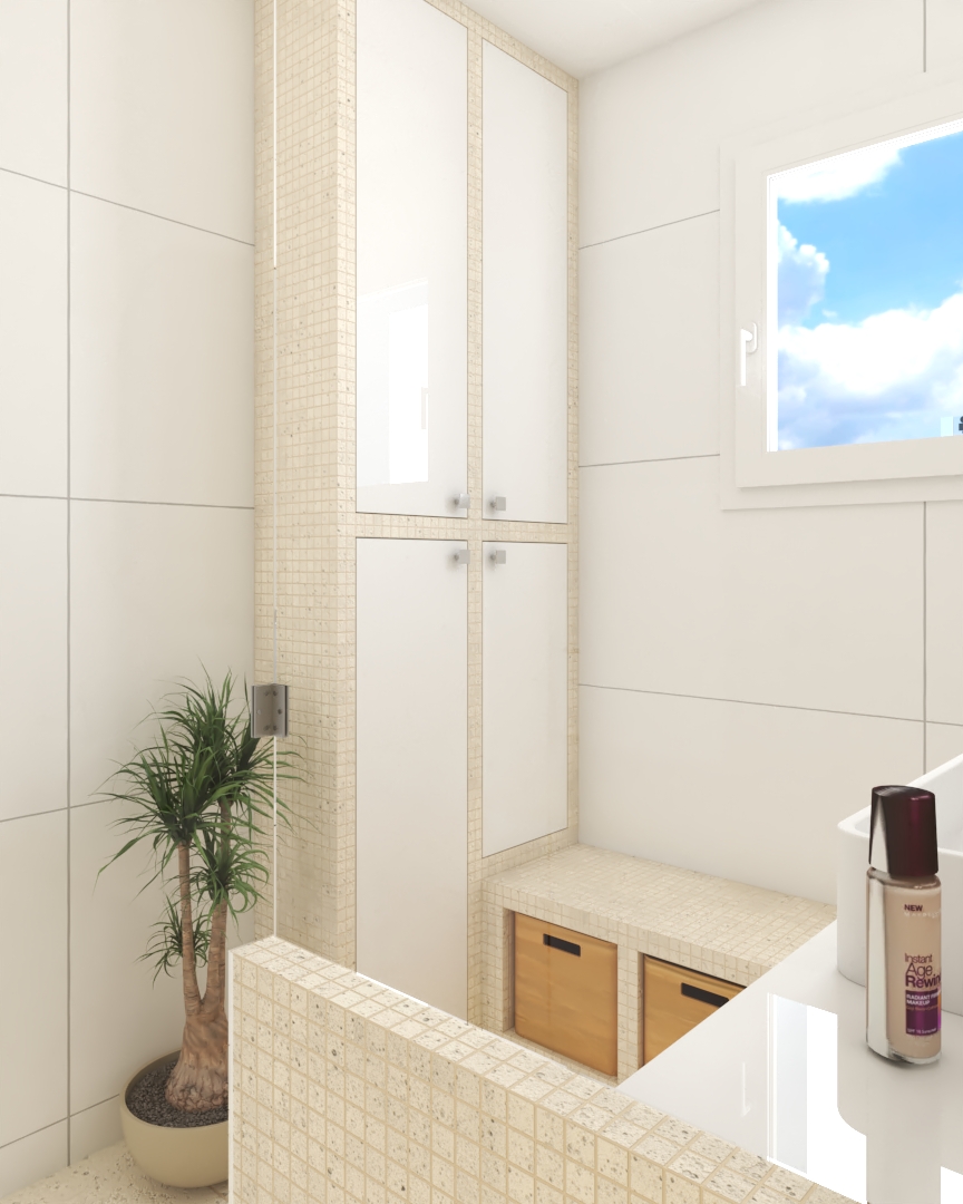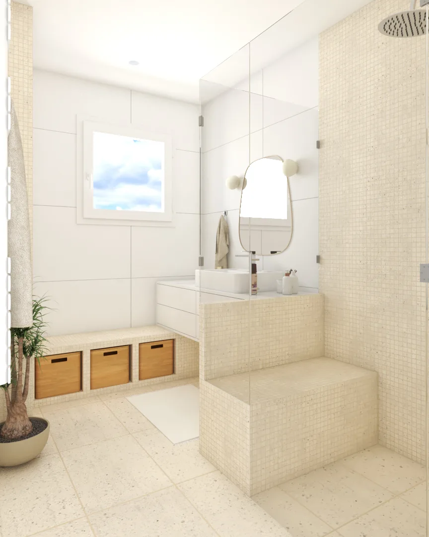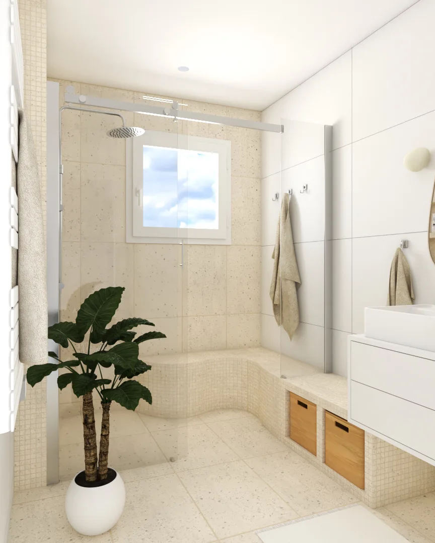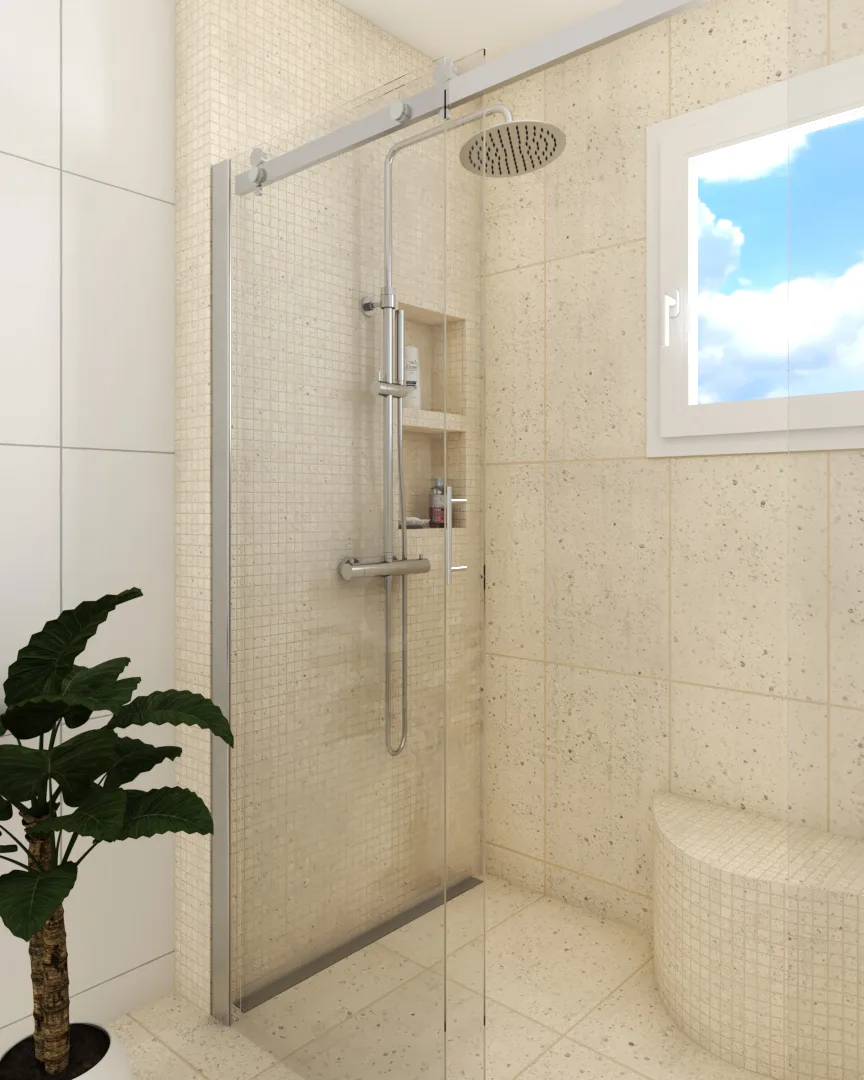 La baignoire a été supprimée, ainsi que l’étroite cabine de douche, afin de laisser place à une vaste douche de 190×100 cm. Cette dimension généreuse permet d’intégrer un long banc tout en rondeur, débutant dans la zone « douche » et se prolongeant jusqu’à l’espace « séchage ». Ce banc offre un appui confortable pour se laver ou s’essuyer en toute sécurité. La grande largeur de la douche permet également d’ouvrir la fenêtre sans contrainte, pour une ventilation optimale.